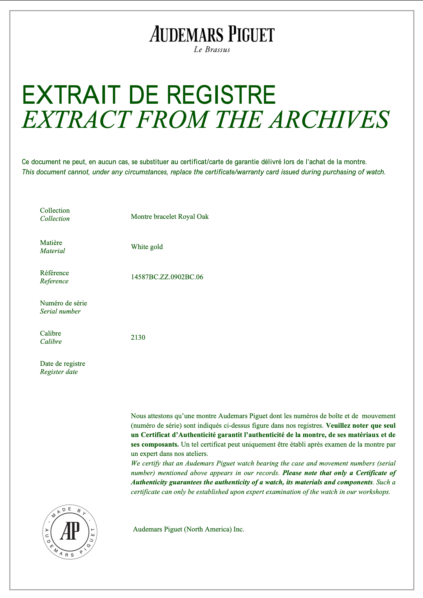 *This timepiece comes with Digital Archive Papers from AP.