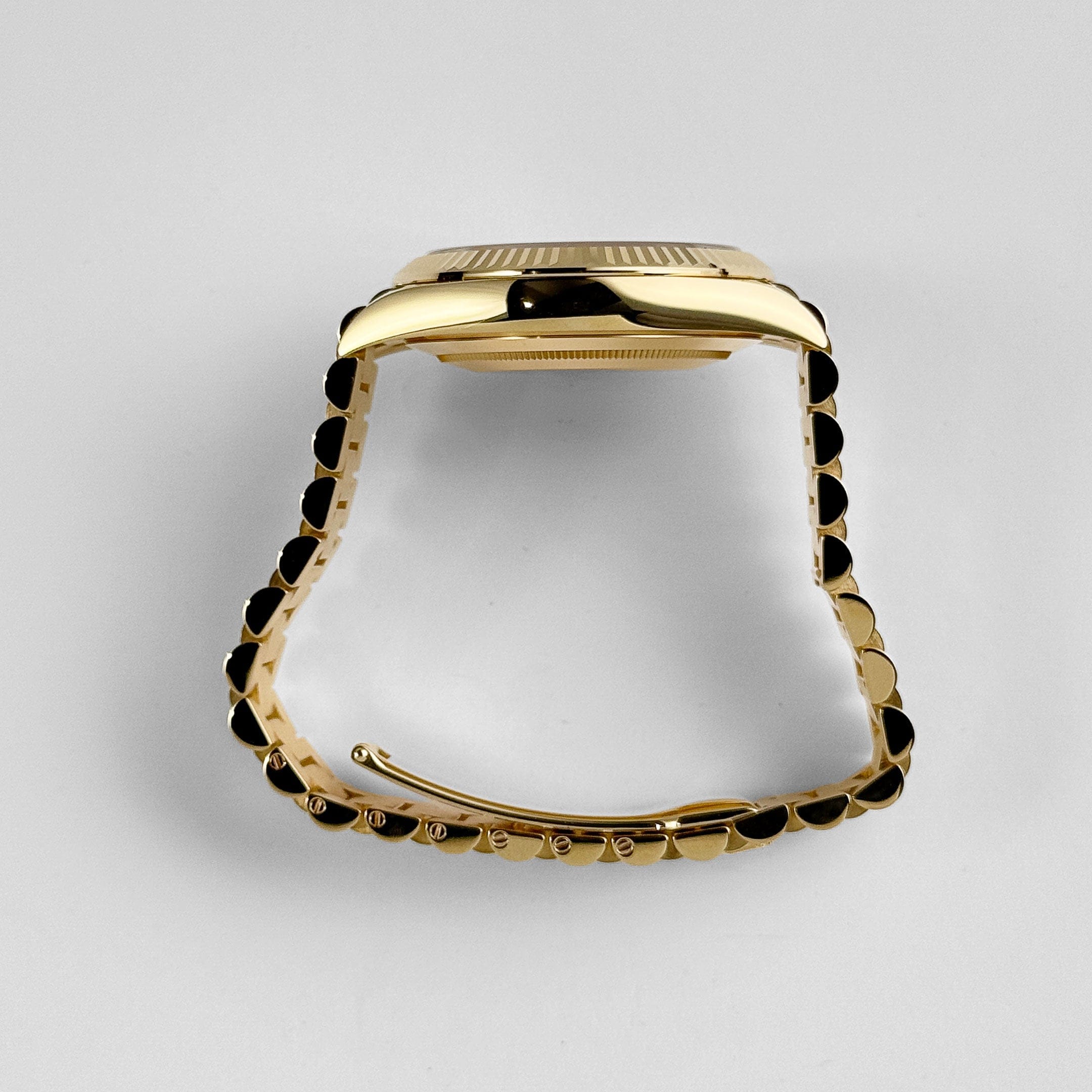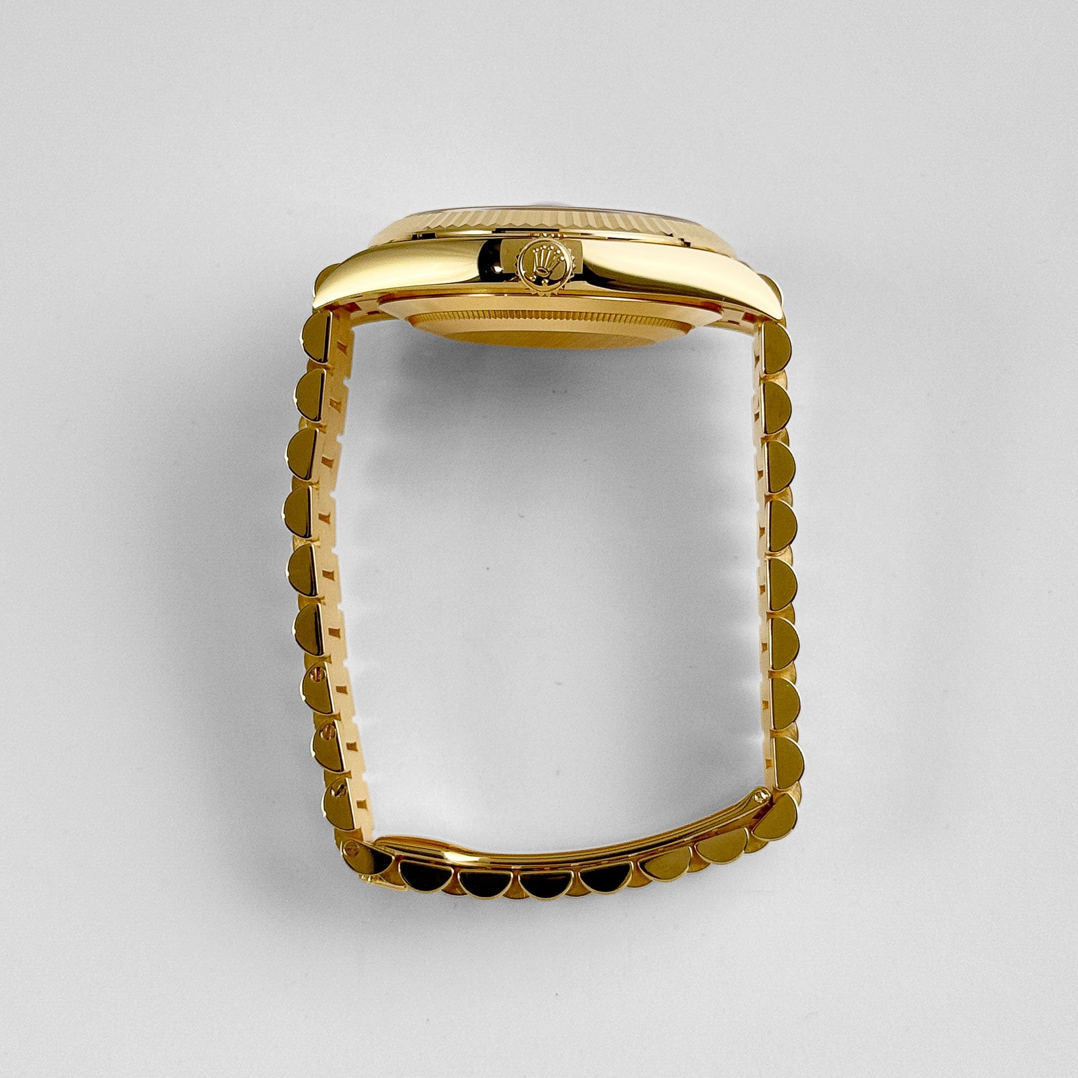 The Rolex Day-Date 40 ref. 228238 is a study in discreet elegance rendered in 18K yellow gold. Its 40 mm Oyster case is harmoniously proportioned—bold without excess—topped by a polished bezel that frames the dial with restraint rather than flash. The President bracelet, crafted entirely in matching yellow gold, flows seamlessly from case to wrist, offering comfort, continuity, and a classic Rolex silhouette.